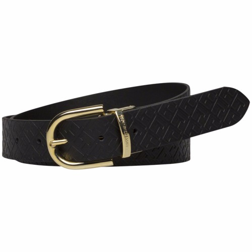 Ceinture Tommy Hilfiger pour femme modèle Emboss Reversible en cuir noir à motifs en relief + un coté en cuir noir lisse facilement interchangeable simplement en pivotant la boucle dorée gravée Tommy Hilfiger.