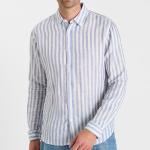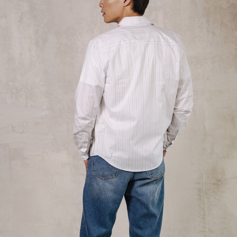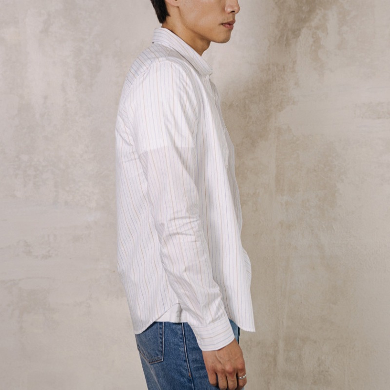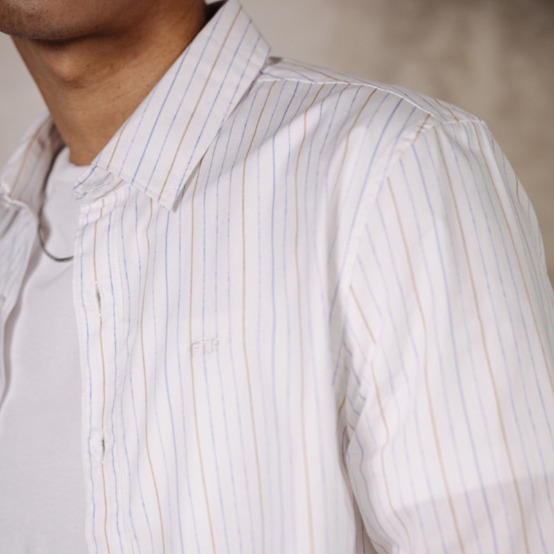 Chemise homme Freeman T Porter modèle Yoris Hamabe en coton blanc à fines rayures bleues et jaunes.