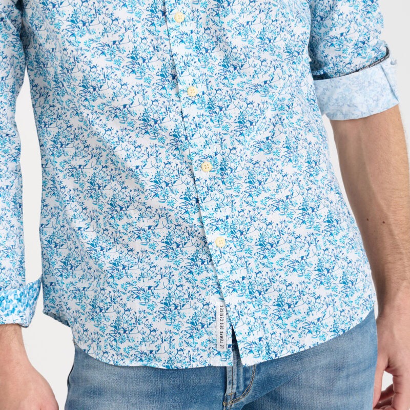 Chemise à manches longues Le Temps des Cerises homme modèle Botix en coton blanc imprimé de motifs fleurs bleues.