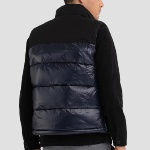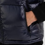 Doudoune sans manches pour homme Replay Jeans avec contraste de couleur et de matière : haut du corps noir mat, bas bleu marine, elle présente un rembourrage très performant en duvet synthétique