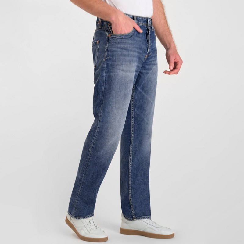 Craquez pour le jean homme Le Temps des Cerises 860 à coupe loose ample, confectionné en denim bleu medium brossé main 99 % coton, alliant confort, style urbain et finitions premium cuir et selvedge pour un look authentique et tendance.