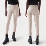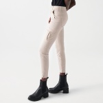 Pantalon cargo Salsa Jeans pour femme coloris blanc / beige clair nommé perle, coupe slim taille haute, longueur 7/8éme avec poches latérales et bas de jambe zippé.