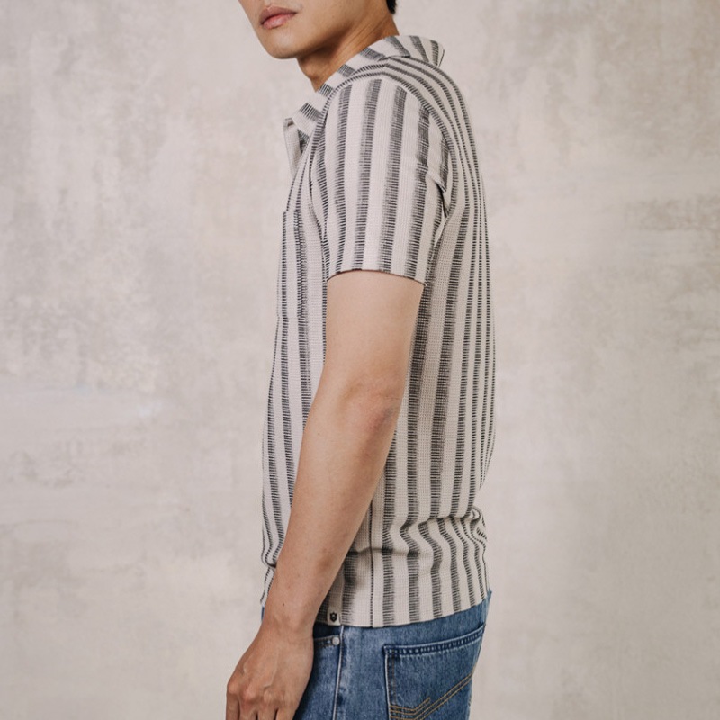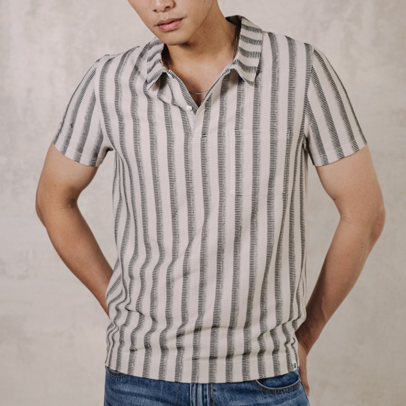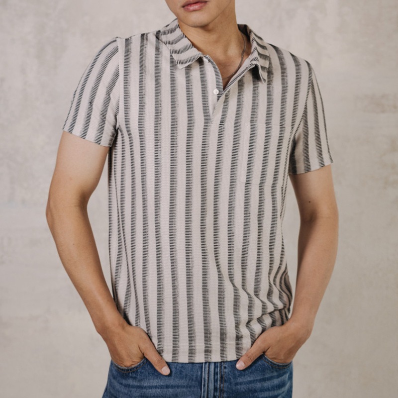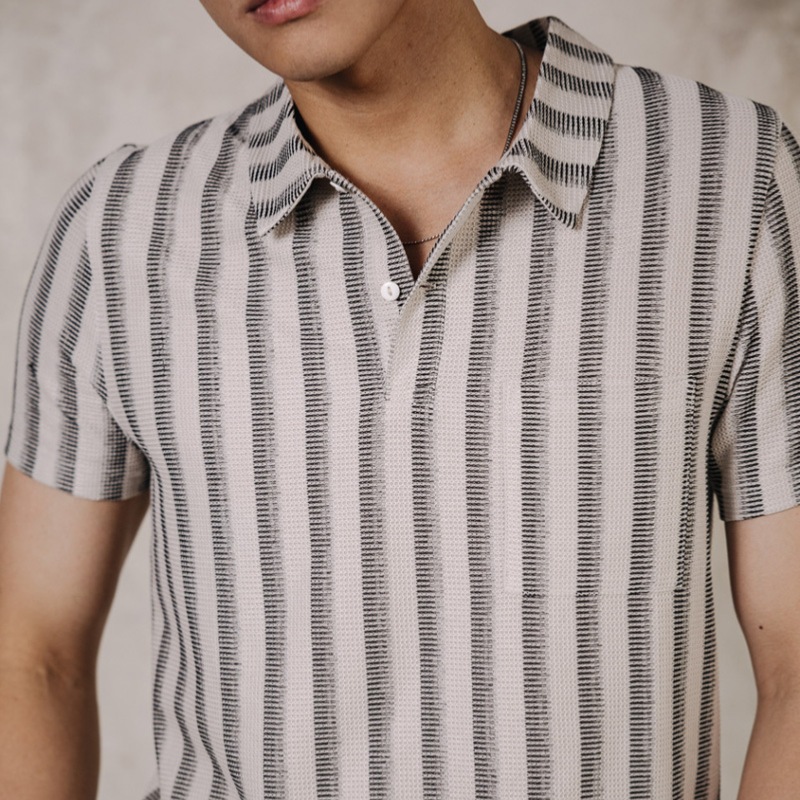 Polo à manches courtes pour homme Freeman T Porter modèle Goro en maille beige sand rayé noir.
