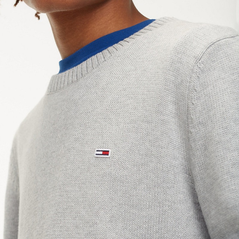 Pull en coton gris Tommy Hilfiger collection Tommy Jeans pour homme, col rond et logo Tommy Hilfiger brodé à la poitrine.