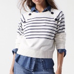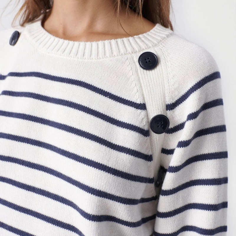 Pull marinière Salsa Jeans pour femme en maille de coton blanc rayé bleu marine, boutons bleu marine brodés.