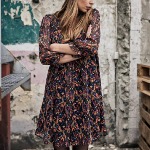 Robe Freeman T Porter modèle Juna Aquarello, fond noir à motif imprimé, coupe évasée, encolure plissée et manches 3/4