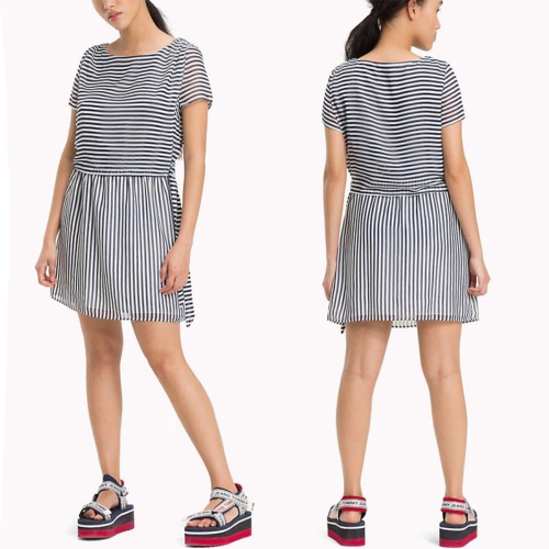 Robe Tommy Hilfiger collection Tommy Jeans fluide et féminine, blanche rayée bleu marine doublée