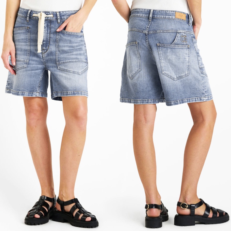 Short en jeans Le Temps des Cerises pour femme Modèle Mado, coupe ample, délavage w1558 avec lien de serrage à la ceinture et poches plaquées.