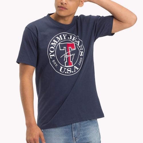 T Shirt Tommy Hilfiger collection Tommy Jeans pour homme modèle Circle Tee en coton bleu marine haute qualité, logo Tommy Jeans Usa blanc et rouge à la poitrine + broderie blanche.