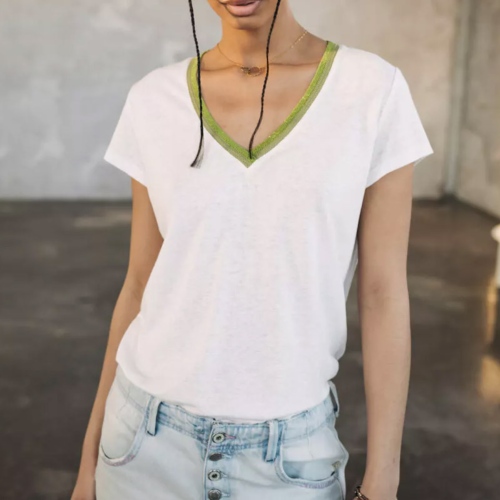 Top / T Shirt manches courtes haute qualité pour femme Freeman T Porter modèle Taile Ribbon en lin et viscose blanc sage avec galon vert sur le contour de col.