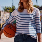 T Shirt manches 7/8éme Freeman T Porter femme modèle Thiane Stripes, coupe regular légèrement ample, confectionné en coton blanc flammé avec rayures bleues french blue, boutons façon marinière sur l'épaule droite et col rond large
