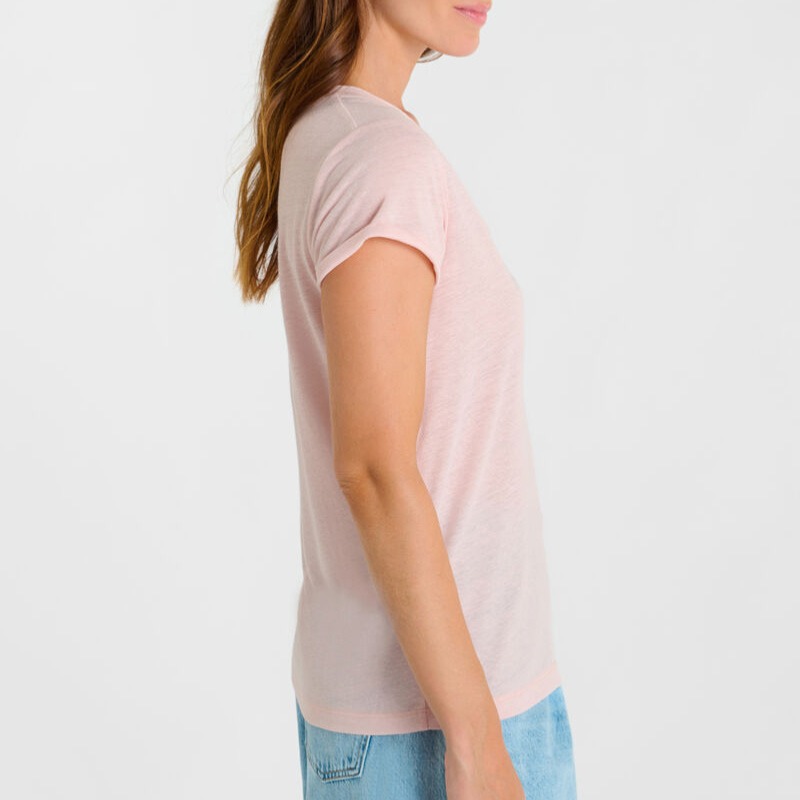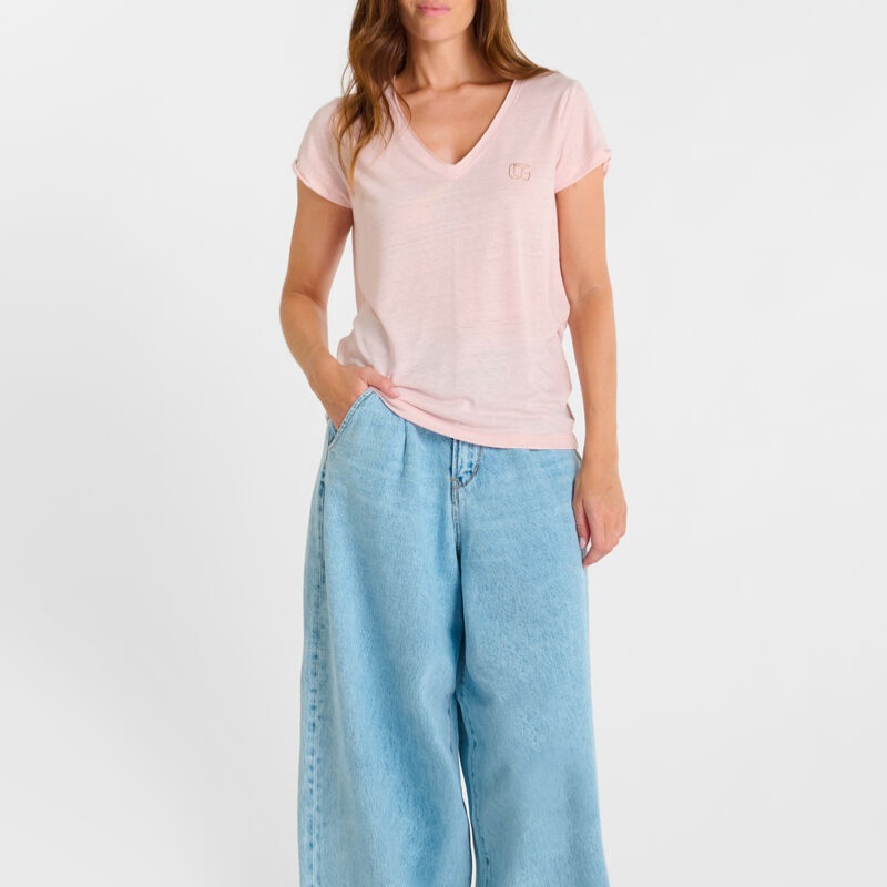 Ce t-shirt col V femme se distingue par sa couture en lurex subtilement brillante au niveau de l’encolure, qui ajoute une note raffinée et tendance. Confectionné dans une matière agréable contenant 30% de lin, il est léger, respirant et parfait pour la belle saison. Ses manches courtes ourlées renforcent son style décontracté chic, facile à porter au quotidien.