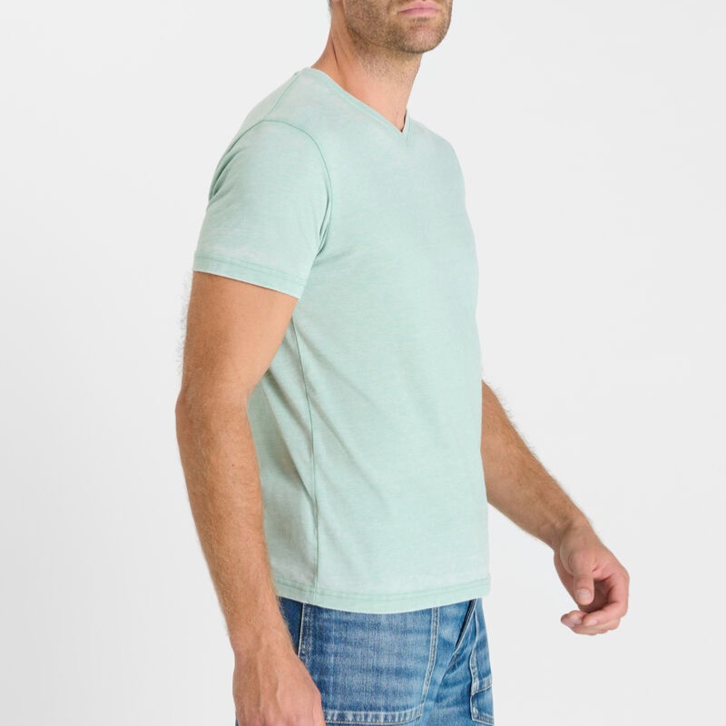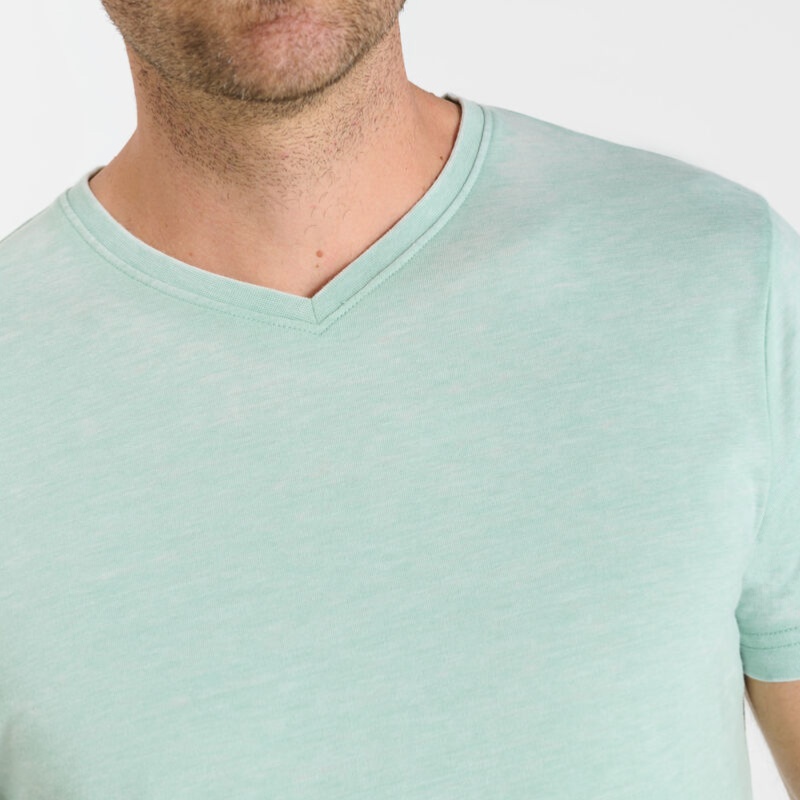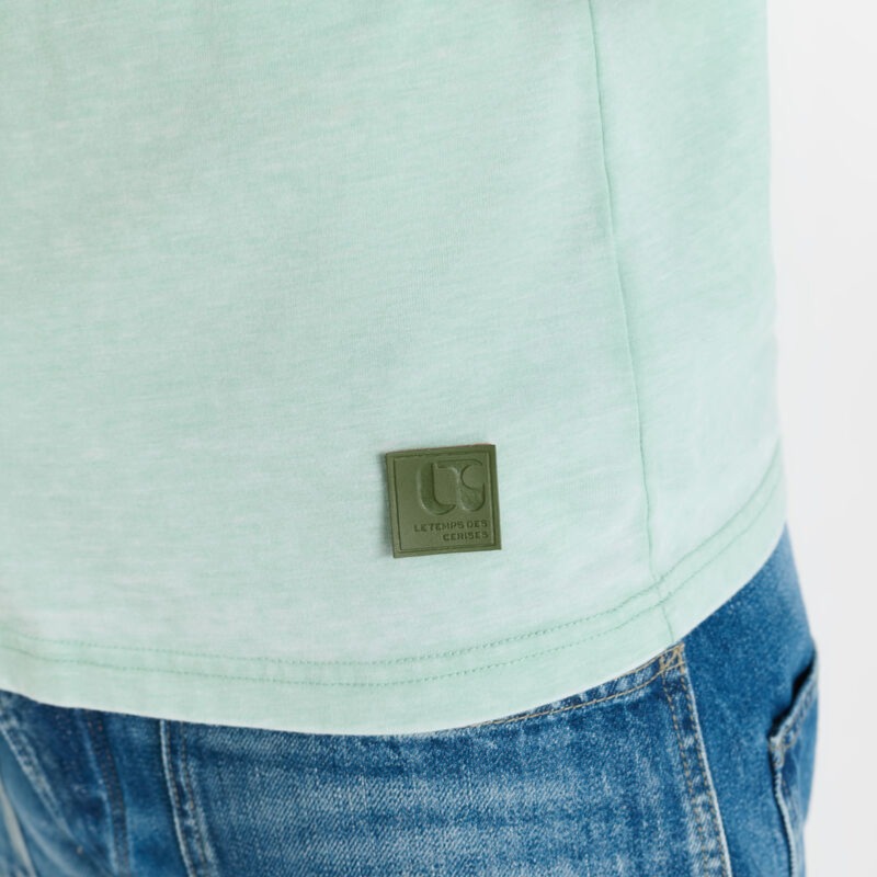 T Shirt Le Temps des Cerises homme modèle Akru couleur bleu / vert chiné nommé harbour, col V, étiquette brodée sur la bas.