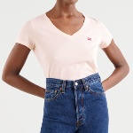 T Shirt à manches courtes Levi's pour femme modèle Perfect Vneck Tee en coton rose saumon scallop shell avec petit logo Levis Batwing rouge brodé à la poitrine