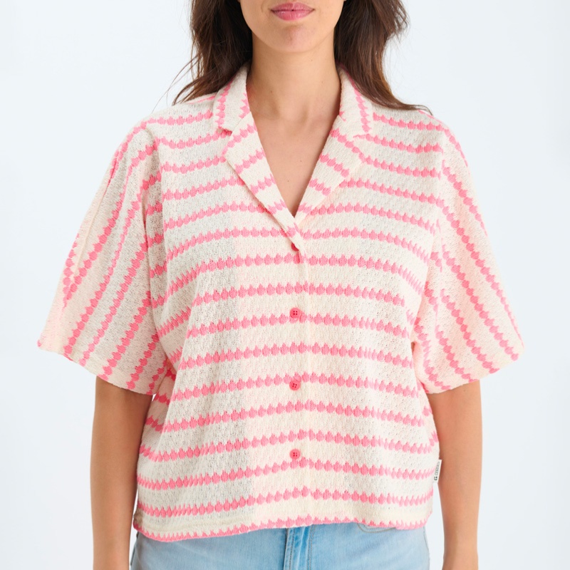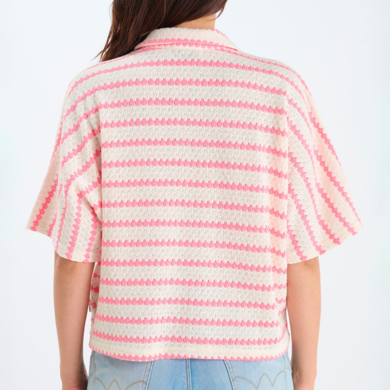 Sa coupe regular assure un tombé naturel et confortable, tandis que son col chemisier apporte une note élégante et soignée. Confectionné en coton mélangé blanc à fines rayures roses, ce top combine douceur et légèreté. Le boutonnage fin renforce son côté raffiné, idéal pour un look casual chic facile à associer avec un jean, un short ou une jupe.