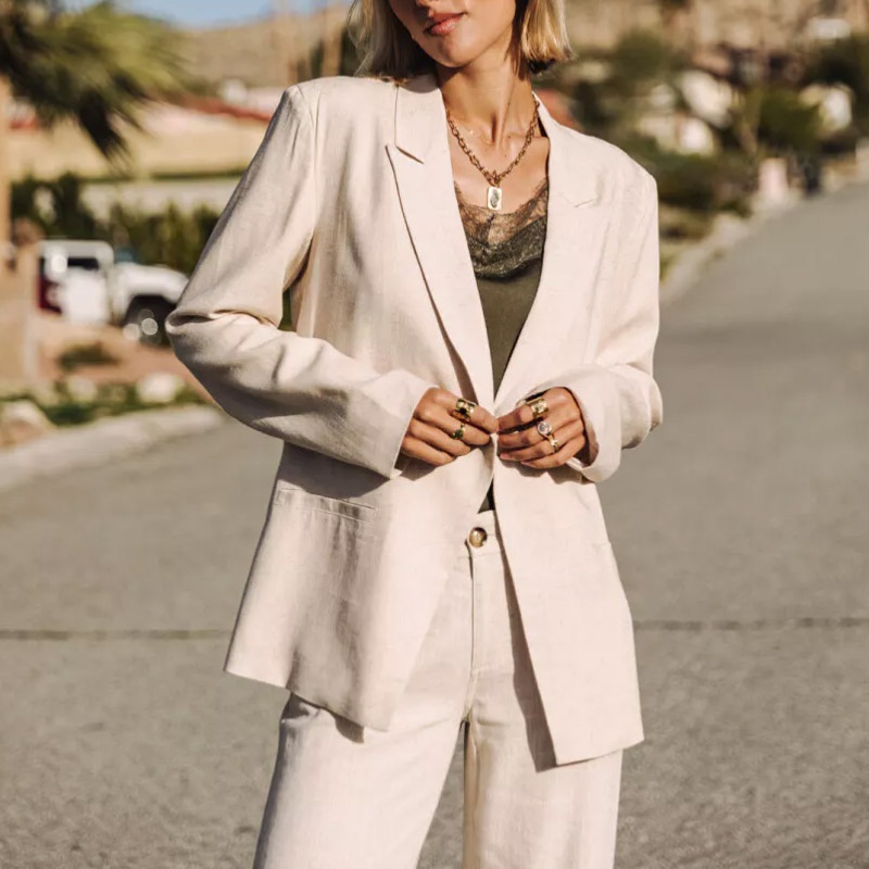 Dépareillée ou en ensemble avec le pantalon agatha, vous aimerez cette pièce iconique de chez Freeman T Porter. Cette veste blazer femme nommée Bernie Plain Linen est confectionnée en viscose et lin beige simply taupe