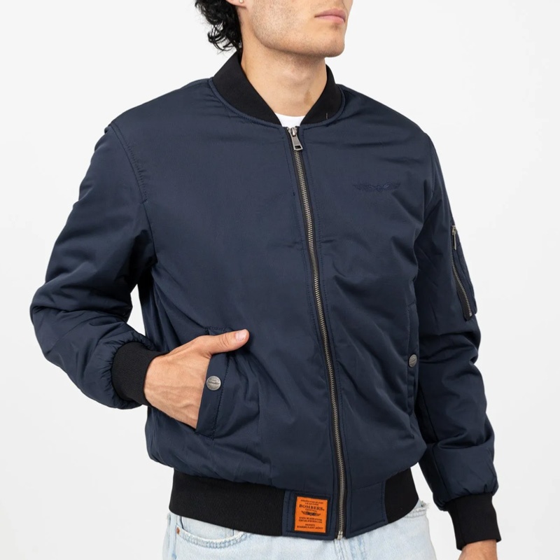 Blouson / Veste Bombers Original pour homme modèle Max en nylon bleu marine navy avec doublure intérieure orange.