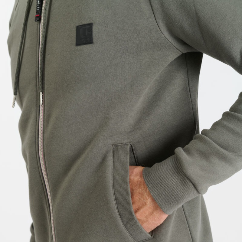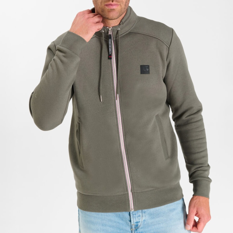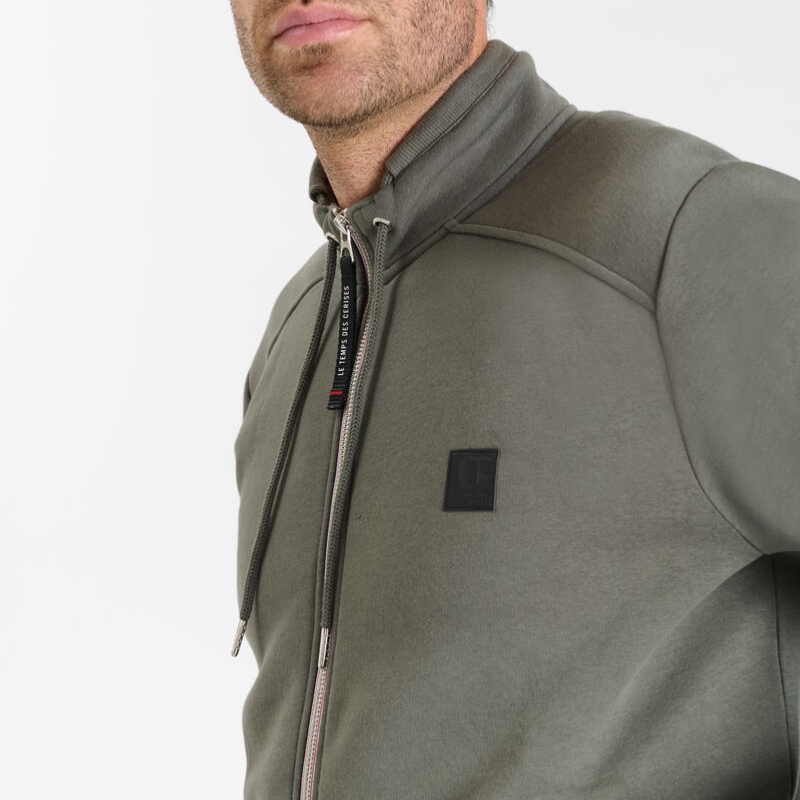 Veste / Sweat zippé Le Temps des Cerises homme modèle Olago coloris kaki dusty, col montant avec lien de serrage